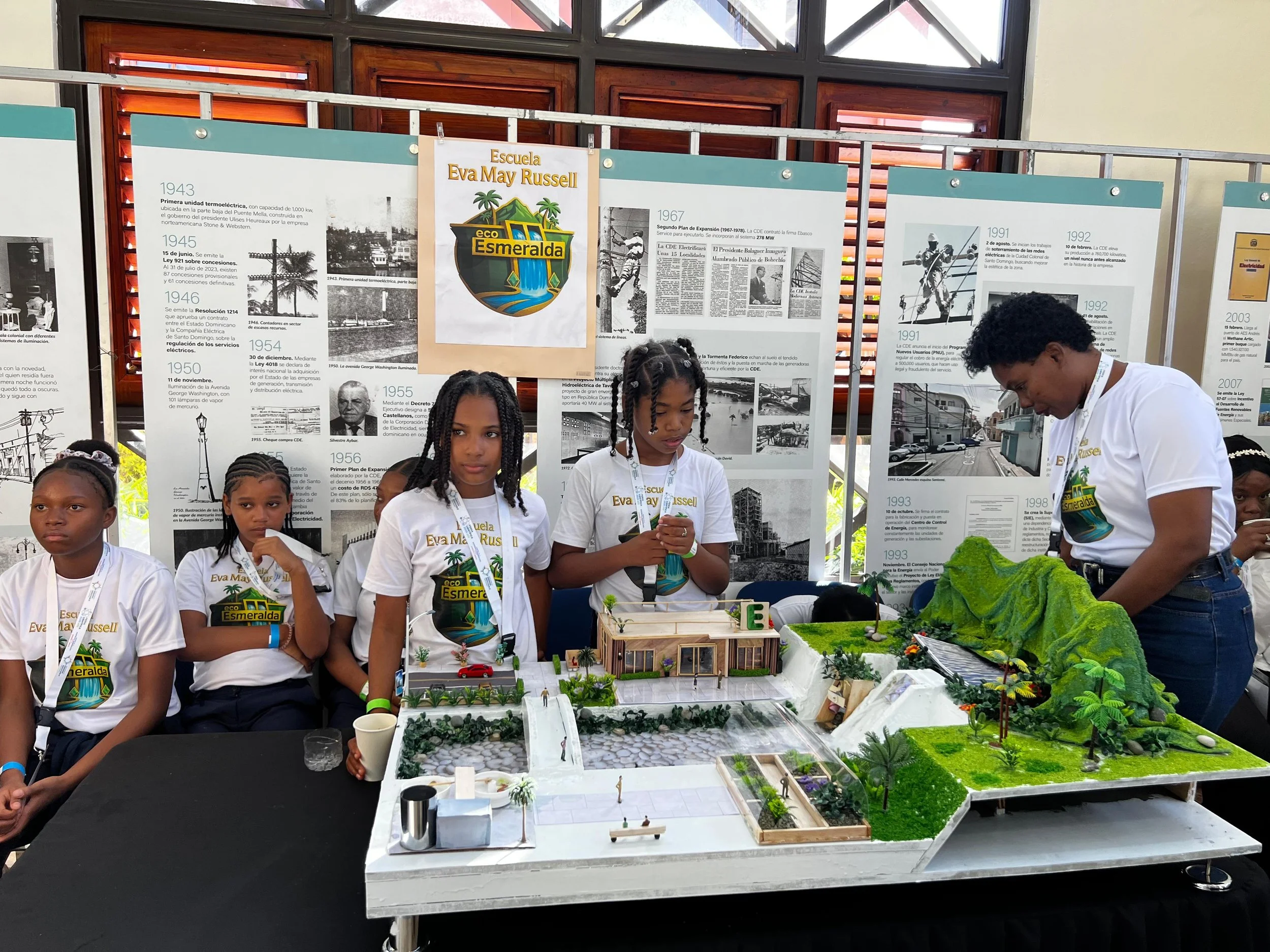 With nearly 2,000 attendees at the event, Eva Russell students presented an intricate model and presentation on the use of renewable energy through hydroelectric power stations. The fair was held at the Renewable Energy Theme Park in Santo Domingo.